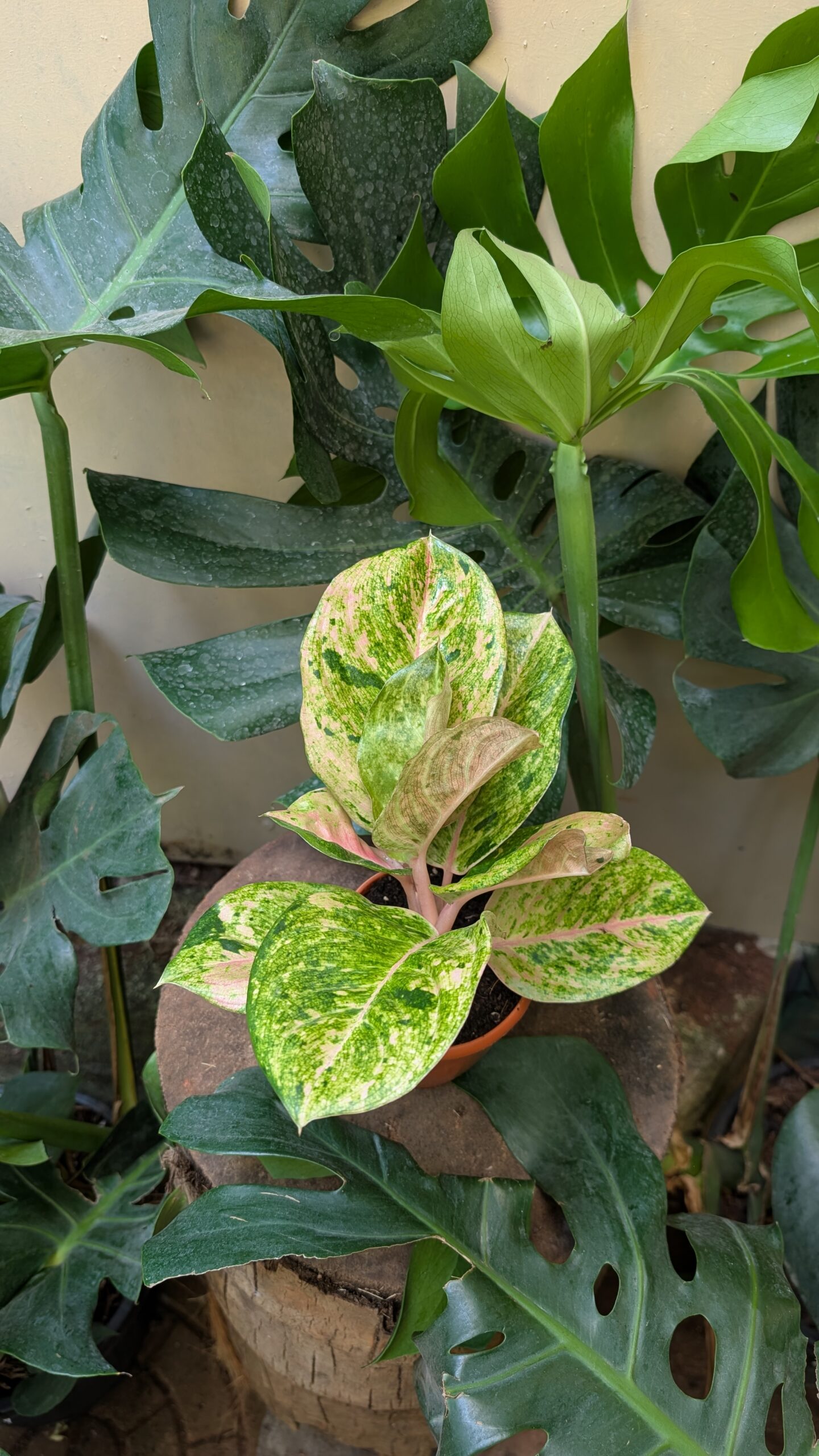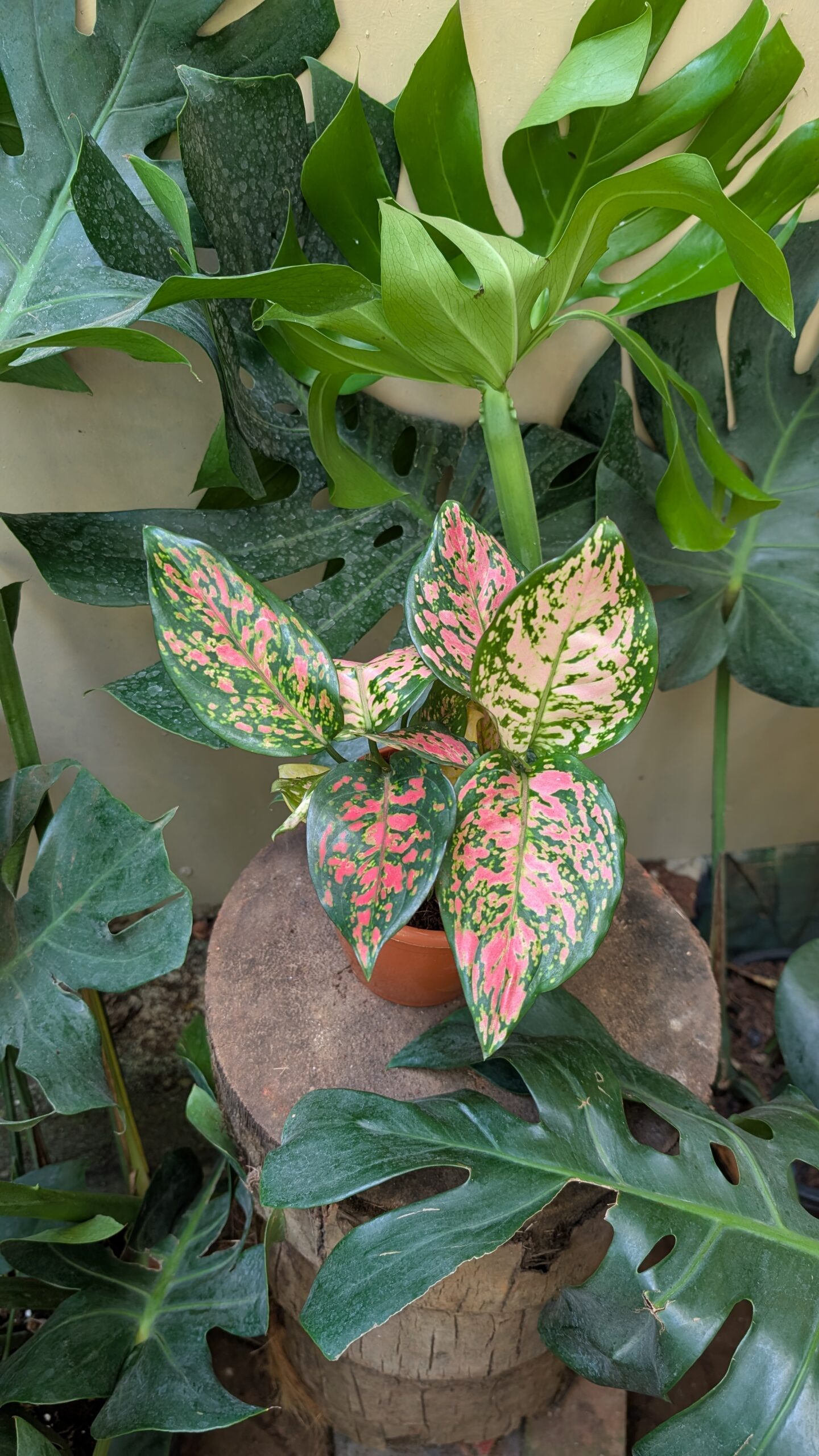 A striking indoor plant with deep green leaves splashed with vibrant pink tones.