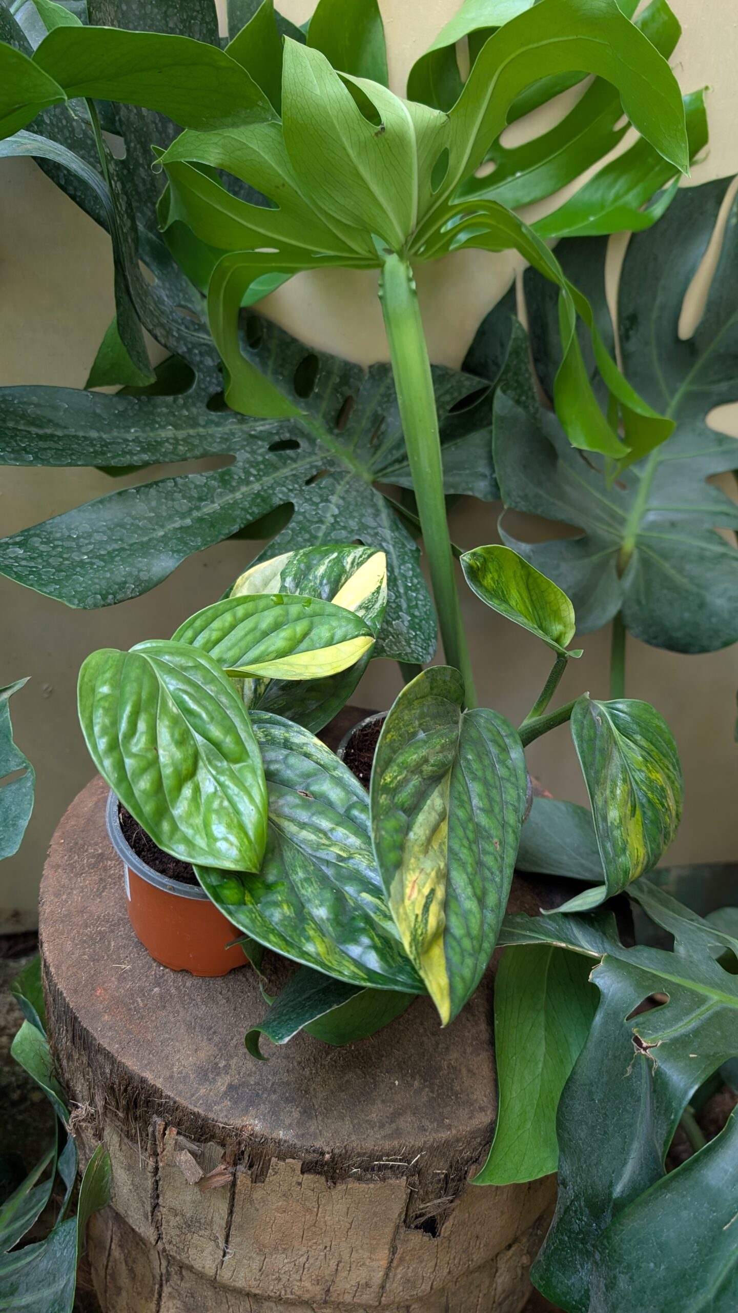 A rare foliage plant with textured, heart-shaped leaves patterned in multiple shades of green.