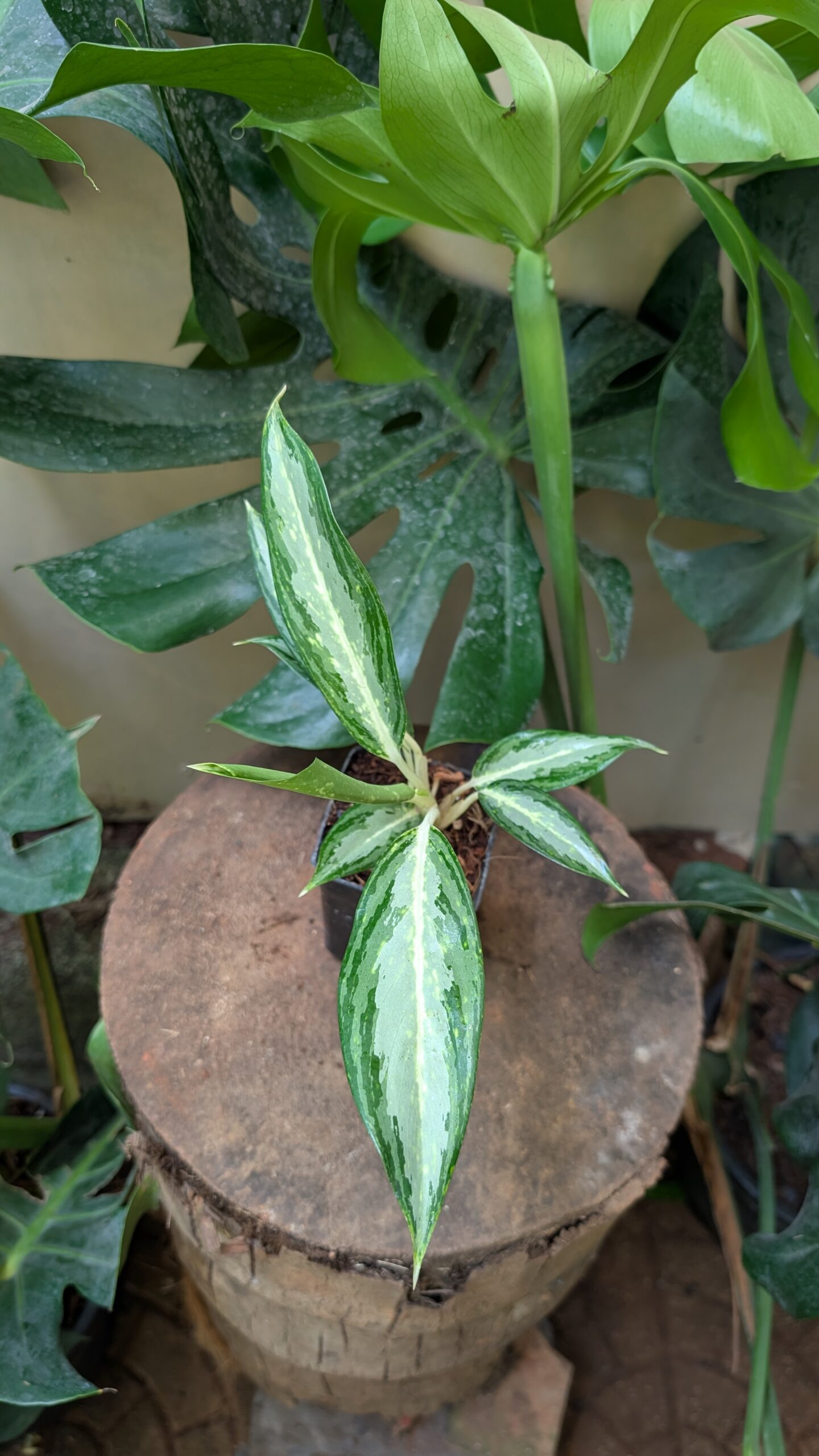 A compact indoor plant with narrow leaves highlighted by silver-green variegation.