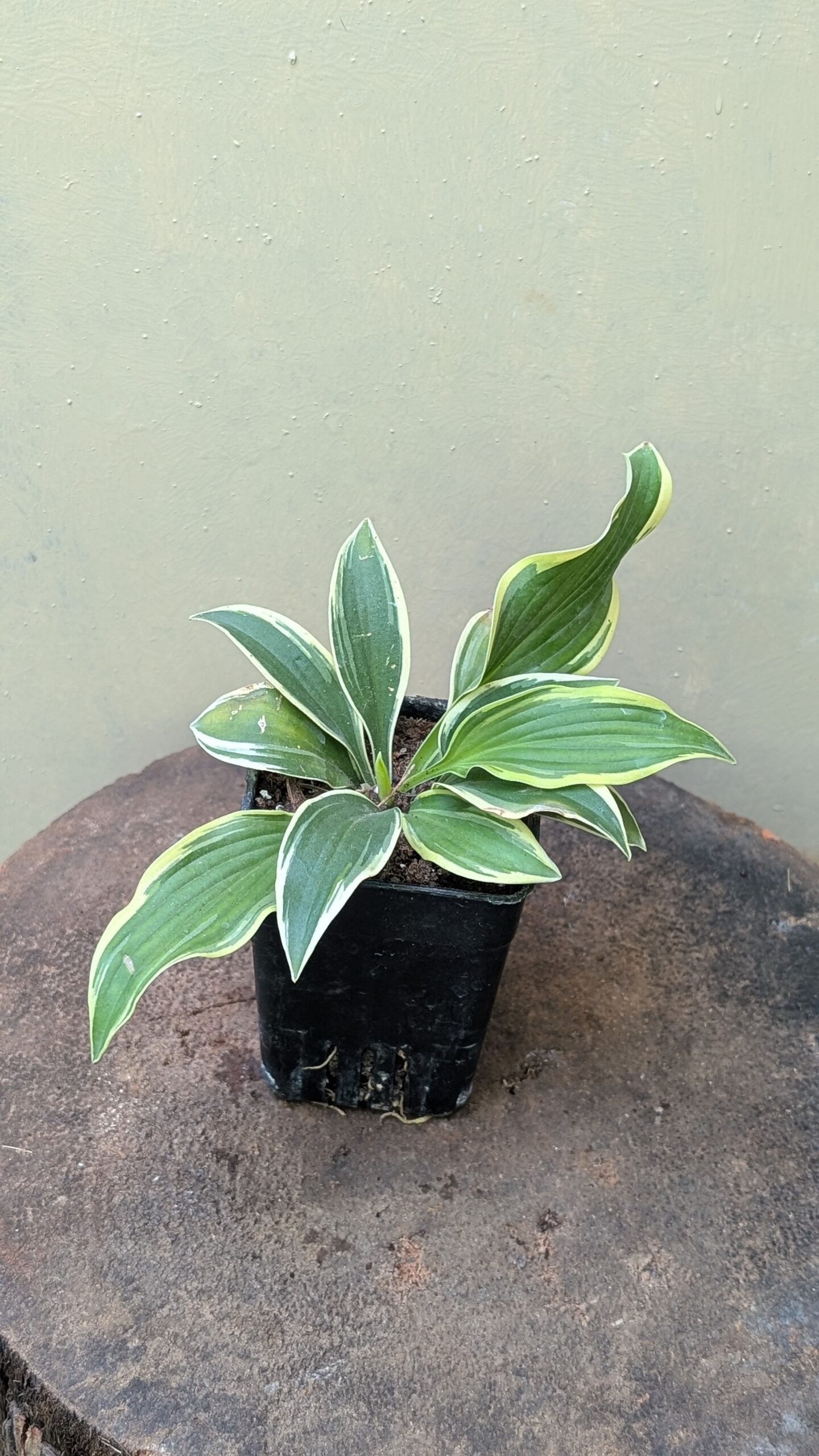A shade-loving ornamental plant with broad green leaves edged in creamy white.