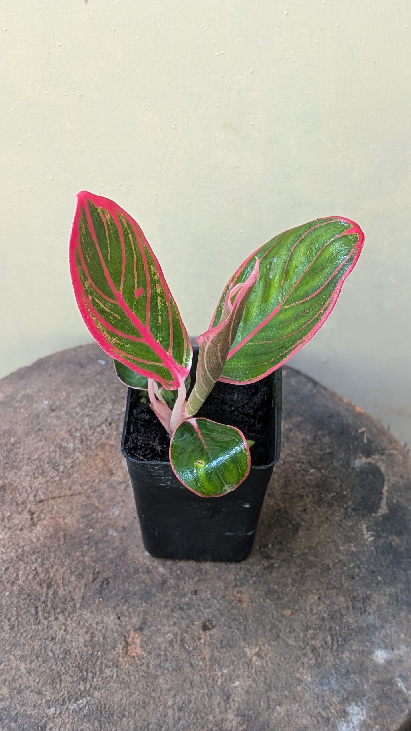 A compact indoor foliage plant with deep green leaves highlighted by bright pink veins.